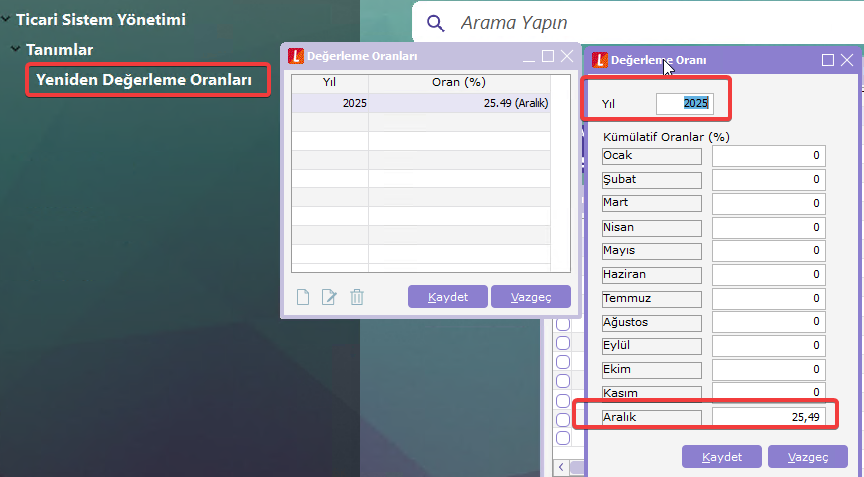 2- Ticari sistem yönetiminde yeniden değerleme oranları girilmelidir.