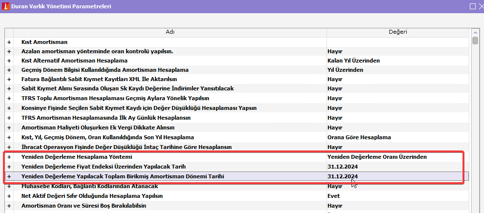3- Ticari sistem yönetimi altında duran varlık parametrelerinde, bir önceki en son değerleme tarihi, başka bir deyişle hesaplamaya esas alınacak başlangıç tarihi girilmelidir. Hesaplamada Yeniden değerleme oranının tercih edildiği de belirtilmelidir. 2025 Aralık ayında yeniden değerleme çalıştıracağız bir önceki değerleme 31.12.2024 olduğu için tarihler aşağıdaki gibi seçilmelidir.