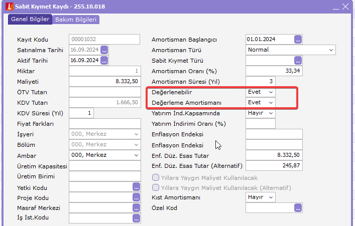 1- Öncelikle Sabit kıymet kaydında yeniden değerleme seçenekleri “evet” olmalıdır.